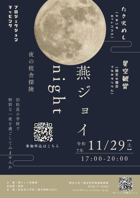 旧松長小学校を舞台に、燕ジョイ活動部メンバーが考案した「夜にやりたいこと」を詰め込みました。