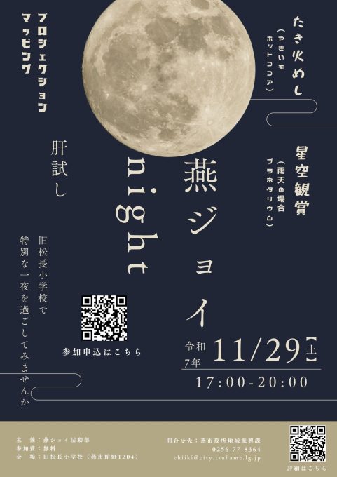 廃校になった旧松長小学校を舞台に、燕ジョイ活動部メンバーが考案した「夜にやりたいこと」を詰め込みました。